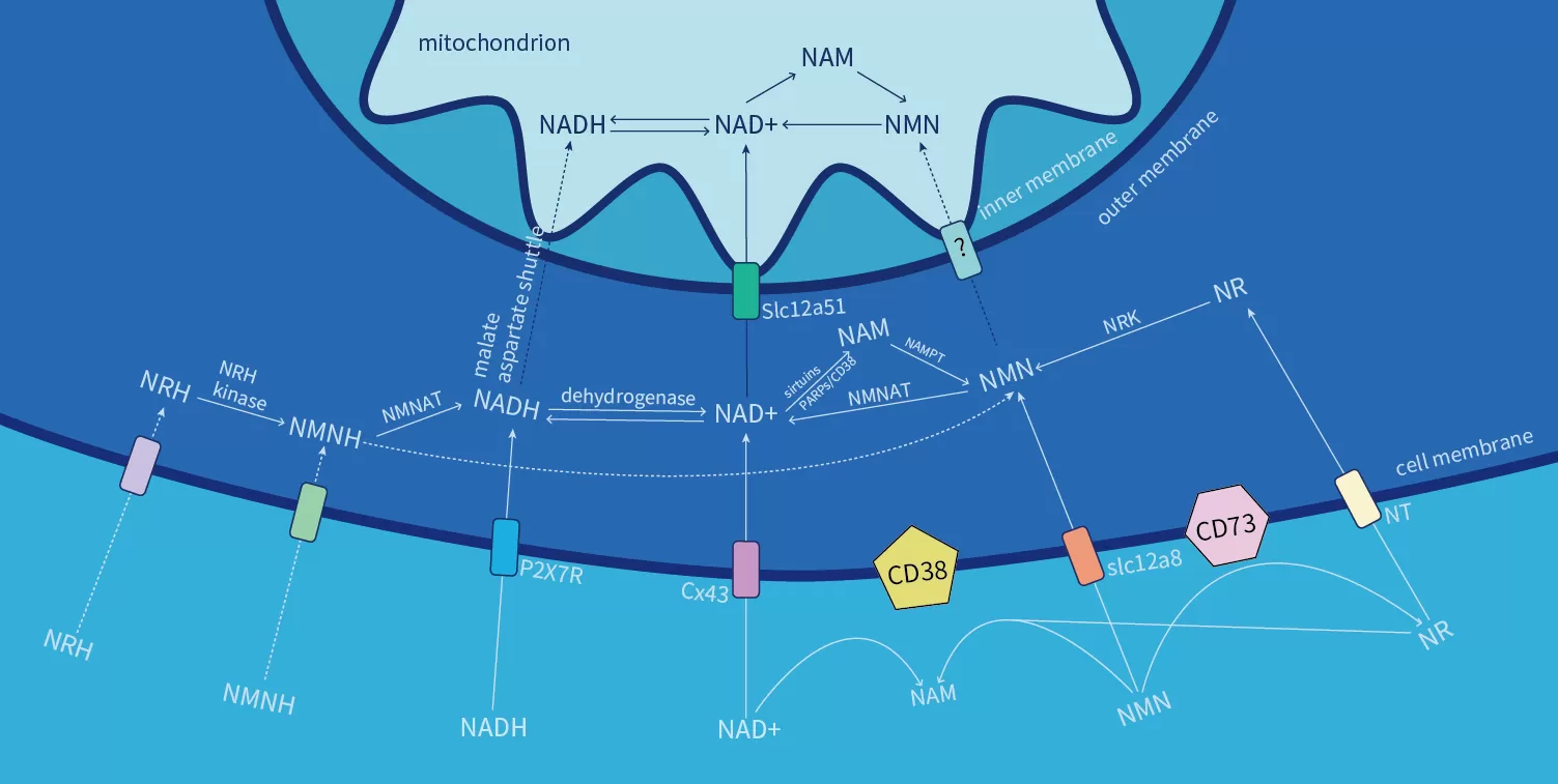 NMN has a clear and efficient absorption pathway for NAD⁺ supplementation: it can directly enter cells through the dedicated Slc12a8 transporter on the cell membrane, without going through complex decomposition and resynthesis processes that waste anti-aging ingredients. Although a small portion of NMN is broken down by glycosidases (such as CD38 and CD73) on the cell membrane surface—enzymes that also consume NAD⁺—most of the NMN enters cells in its intact form to convert into NAD⁺ and exert anti-aging effects.